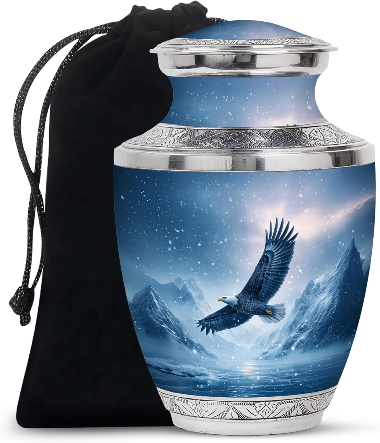 Honor the memory of your loved one with this royal flying eagle cremation urn, a surprising tribute that symbolizes freedom, power and permanent feeling of those who have passed. This beautifully crafted funeral urn features a beautiful flying eagle with american flag, symbolize courage and immense love of the sky. This memorial urn for adult remains is suitable for the ashes of a full grown adult and is ideal for both men and women. Its timeless and elegant design makes it perfect for home display, burial, or niche placement. If you’re looking for urns for human ashes adult man, burial urns for adult human ashes, or a meaningful urn for ashes for women, this piece blends powerful symbolism with refined artistry. The safe lid of this burial mother and father urn for adult human ensures that their remains are preserved, for human ash this large urn for women ashes is perfect for both individual and shared monuments, with a shape that can easily adjust the adult ash. Our eagle cremation is not only a suitable tribute to the strength and grace of your loved one, but also a versatile and elegant monument that works for both men and women. This memorials cremation urns for human ashes features a wide mouth opening for easy ash transfer and safely keep your loved one's ashes always close to you.